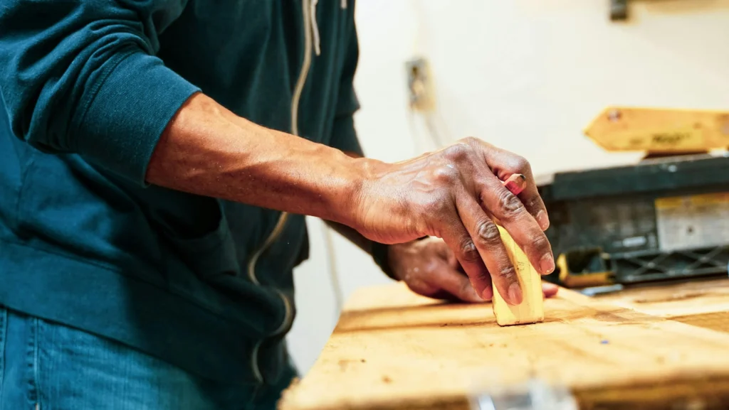 Sanding is the process that changes wood that has bumps and is uneven into a smooth and shiny surface. You should first use coarse-grit sandpaper (roughly 80–100 grit) to take off the bumps and then proceed to fine-grit grits (up to 220 grit) to make the surface shine.